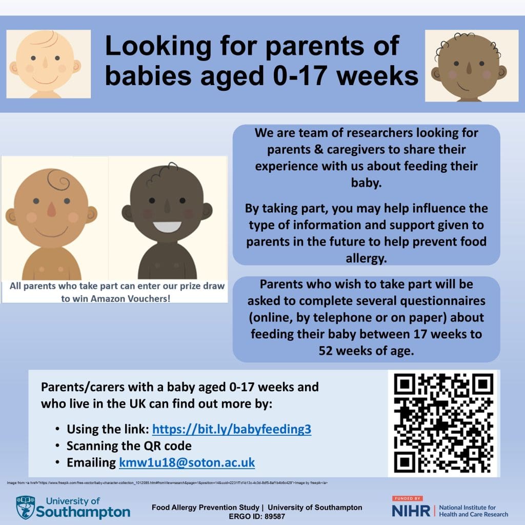 Researchers want to understand your experiences and views about feeding your baby and feeding foods to babies that may cause food allergy. They hope to include as many parents as possible to represent the experiences and views of a wide range of people.